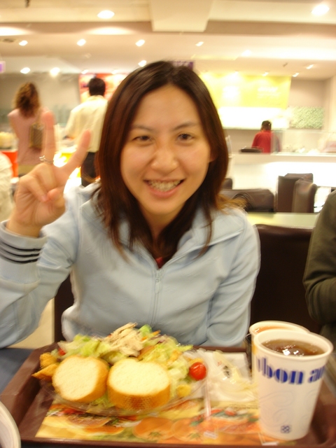 在華航櫃臺排隊畫位時,我們看到去年我和barga去巴里島時的領隊也在排隊幫客人畫位,真是巧!不過我們並沒有和他打招呼。畫完位,我們就先找地方吃東西等登機。au bon pain的拿鐵喝起來實在奇怪,酸的咖啡真的不適合做拿鐵,小毛點了一大盤沙拉,不過居然客氣的沒吃完,看來她身上那件緊繃的牛仔褲對她的食慾產生了一些嚇阻作用。