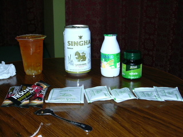 吃完晚餐,我們在街上閒逛了一下,視線所及全是西方人的身影,除了我們之外,居然沒看見半個東方人,讓我們很有身處異國的感覺,後來我們去便利商店買了些飲料和蚊香就回房間了。回到房內,發現蚊子都不見了,看來飯店的人真的有聽懂我在說什麼,服務也還不錯,不過我們還是點了蚊香以防萬一。晚上,我們先把之後的行程大概排了一下,各自盥洗完畢後,就拿出骰子開始玩起吹牛大王和激爆骰子樂。剛剛在便利商店買的飲料這時全排列在桌上,混在一起當作輸家的處罰。